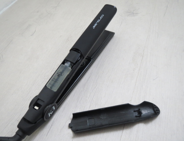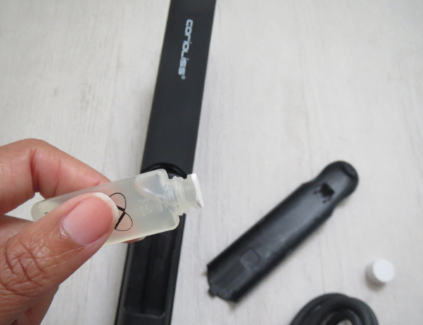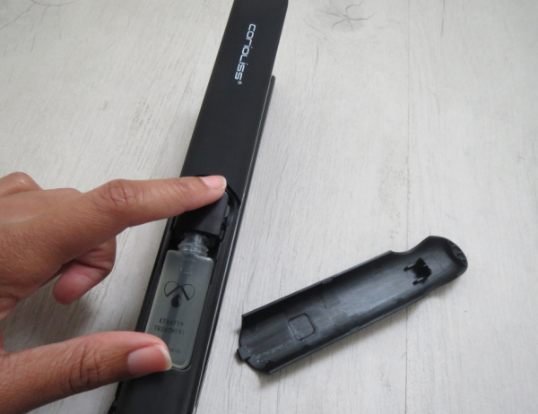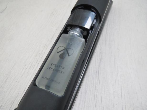 En voyant le lisseur, on n’imagine pas qu’il cache un petit secret. En effet, il ressemble à n’importe quel autre lisseur puisque la capsule se glisse dans le diffuseur qui se trouve sous le « capot ». Une fois la capsule installée, il suffit d’appuyer une seule fois sur un bouton qui déclenche la diffusion du traitement. Pour ceux qui s’y connaissent, les plaques sont en Céramique Tourmaline. Un passage suffit pour sentir la différence : les cheveux sont souples et doux.