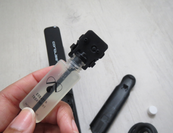 Le lisseur est vendu avec une boîte de 12 capsules de Keratin Elixr. Ce traitement convient à tous les types de cheveux et particulièrement à ceux qui sont secs et fragilisés. La kératine est en effet connue pour ses nombreuses vertus. Elle va restaurer la fibre capillaire, hydrater, protéger et renforcer le cheveu.